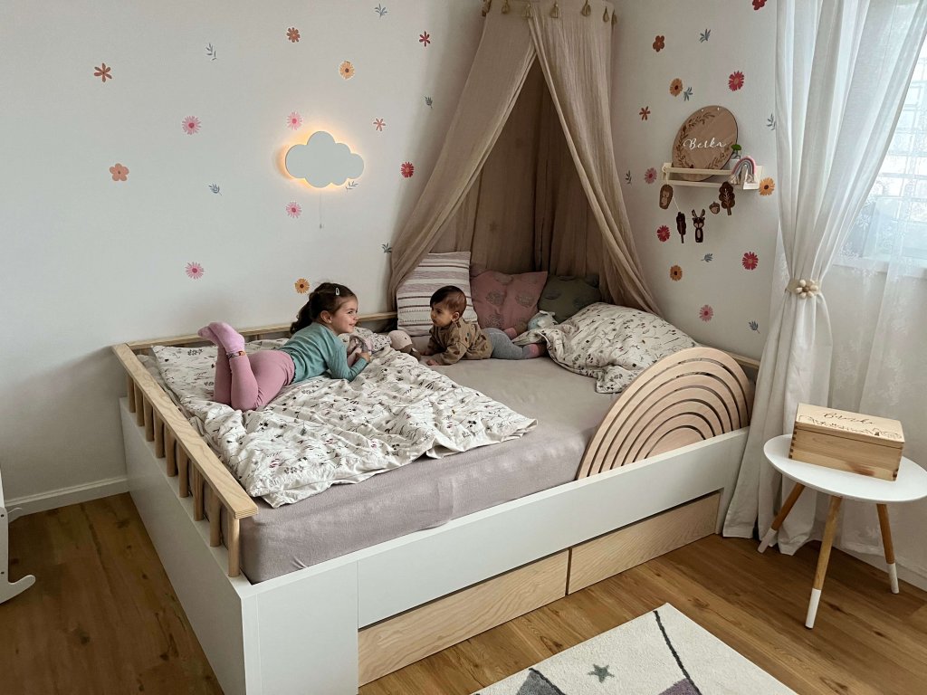 Minimalistická volba k vytvoření zábrany na postel 🌸 Velkou výhodu považuji, že je instalace velmi snadná a dceři přesunujeme dle potřeby, když se rozhodne spát na druhé straně postele, tak zábranu jednoduše přesuneme. Zároveň skvěle plní funkci a dceru chrání před pádem. Navíc skvěle vypadá a dodá pokojíčku šmrnc ✨