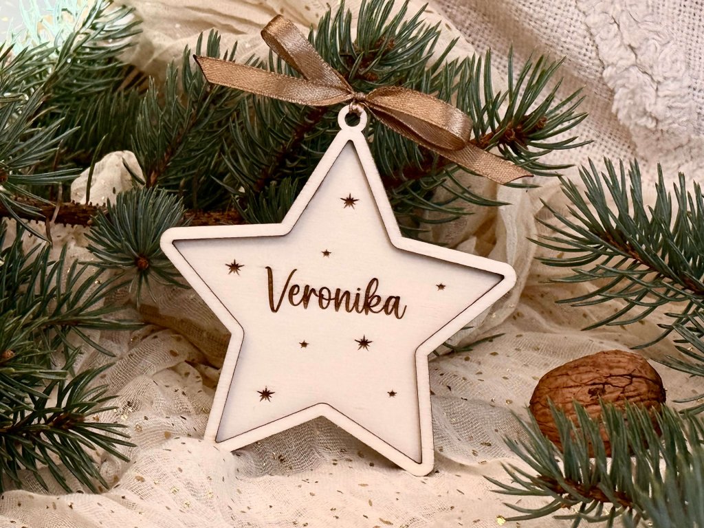 Vyrobena ve tvaru hvězdy, ozdoby s jemně gravírovaným obrázkem a možností personalizace jména dle vašeho přání.