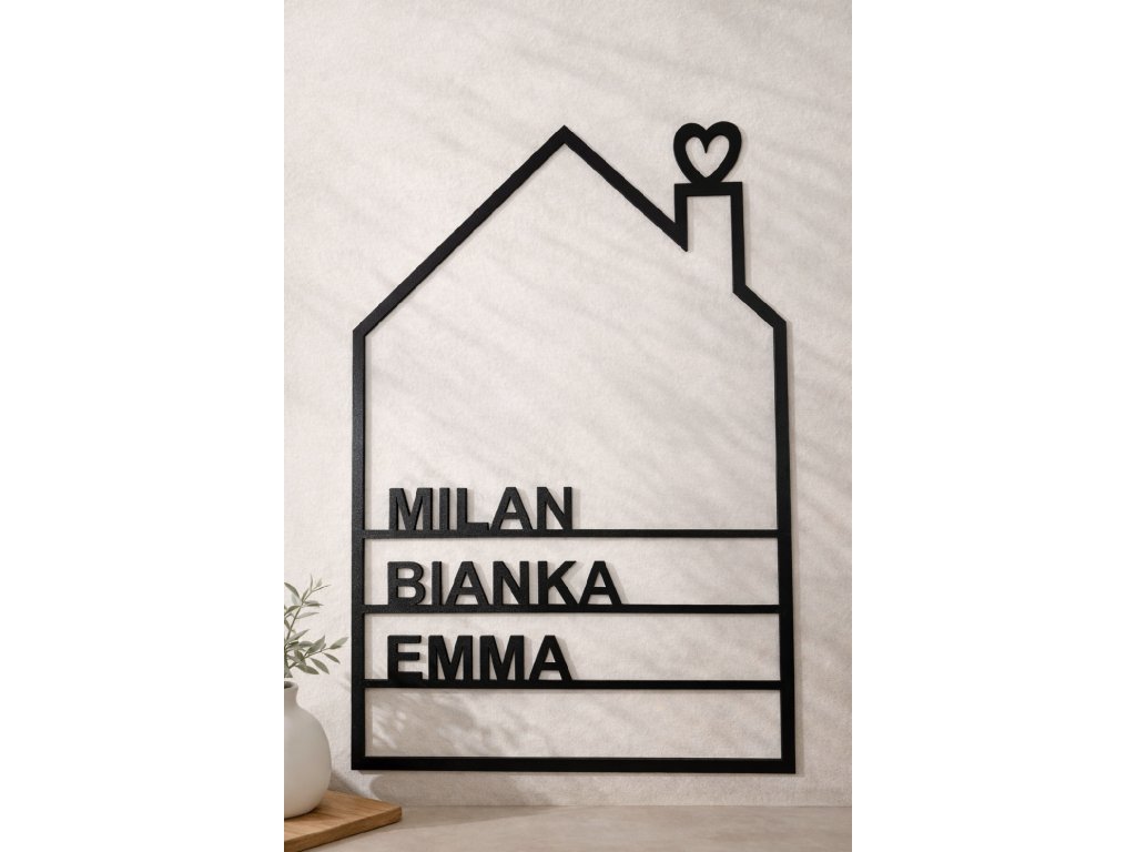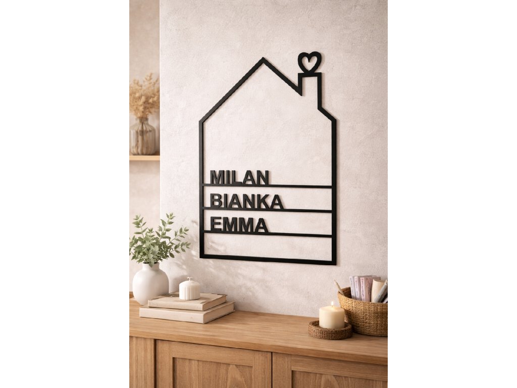 Originální rodinná dekorace z MDF ve tvaru domečku s možností personalizace až 6 jmen. Elegantní a moderní design s jemným srdíčkem vytváří symbol domova, rodiny a lásky. Dekorace je ideální jako stylový doplněk do interiéru i jako personalizovaný dárek pro rodinu, novomanžele nebo nové bydlení.