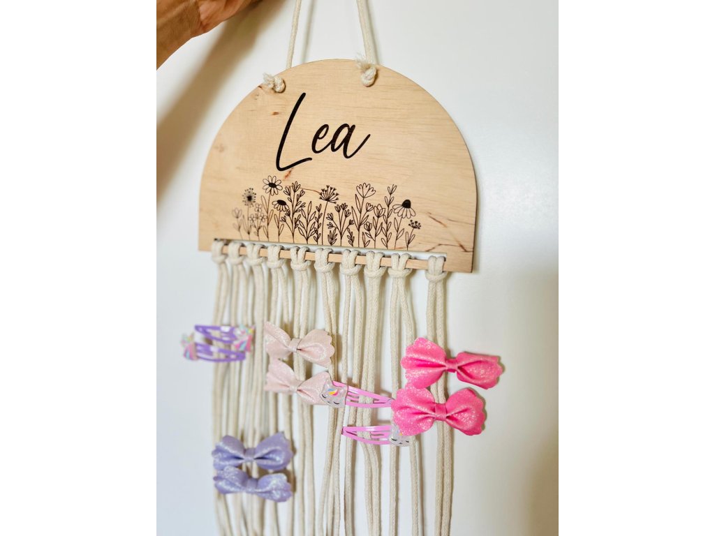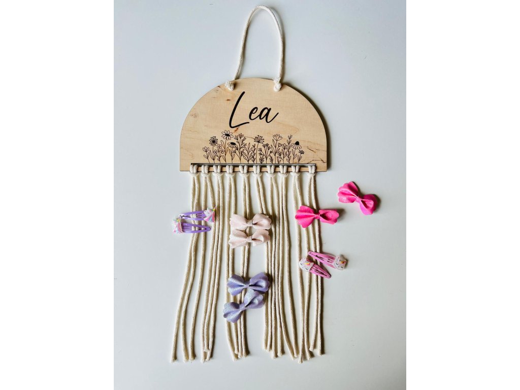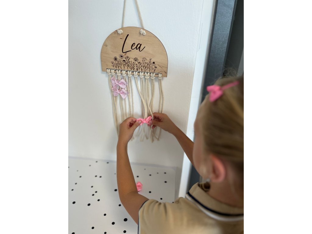 Tento jedinečný doplněk vznikl s myšlenkou na každodenní realitu malých parádnic – všechno má své místo a přitom to krásně vypadá. Na horní části je dřevěná půlkruhová tabulka s jemným květinovým gravírováním a jménem dítěte, které si zvolíte při objednávce. Díky možnosti personalizace se sponkovník stává originálním a velmi osobním dárkem k narozeninám, svátku nebo jen tak pro radost.